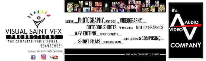 Visualsaint Vfx, we take up every assignment seriously and work in delivering creative results! We specialize in Baby shoot, Maternity shoot, portrait photography, candids, Pre Wedding, Wedding, modelling portfolio and the list goes on endlessly. We make your special events even more special with our creative and amazing photography that speaks! We have a decade long experience in photography, cinematography, sound recording, movie making assistance such as direction, special effects, etc. It all depends on what our customers want and we will be on our toe to do it! We are a team of 20 professionally trained individuals to cater to various needs of our customer. Please Do Check our Social Media Handles for Latest Updates!!!We believe photography and videography is a way of feeling, touching and loving people! What has been photographed or videographed stays forever. As life moves on and things get prioritized, the photographs/videographs are the proof that speaks whenever we want to cherish the special moments! That’s why we proudly say we transform moments to memories.